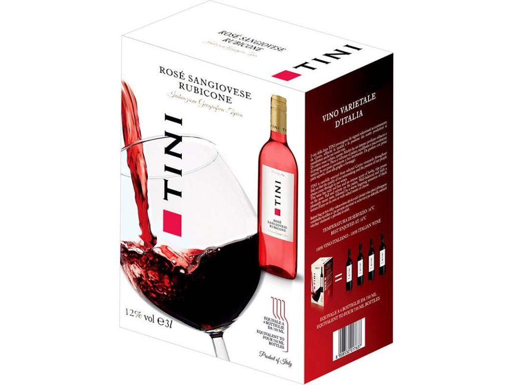 Tini Rosé Sangiovese Rubicone IGT 3l BiB je růžové víno založené na Sangiovese, které v oblasti Rubicone nabízí spíše lehký, svěží projev s jemnou ovocností. Cílem této řady je nabídnout jednoduché, příjemné víno pro každodenní použití, které je snadné na párování i servírování.