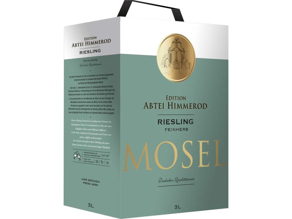 Abtei Himmerod Riesling Feinherb 3l BiB pochází z moselské oblasti, kde se ryzlink tradičně vyznačuje lehčím tělem, vyšší kyselinou a výraznější mineralitou. Styl Feinherb označuje polosuché ladění, které kombinuje lehký zbytkový cukr s přirozenou svěžestí ryzlinku. Praktické BiB balení umožňuje dlouhodobější domácí podávání se stabilním profilem po otevření.